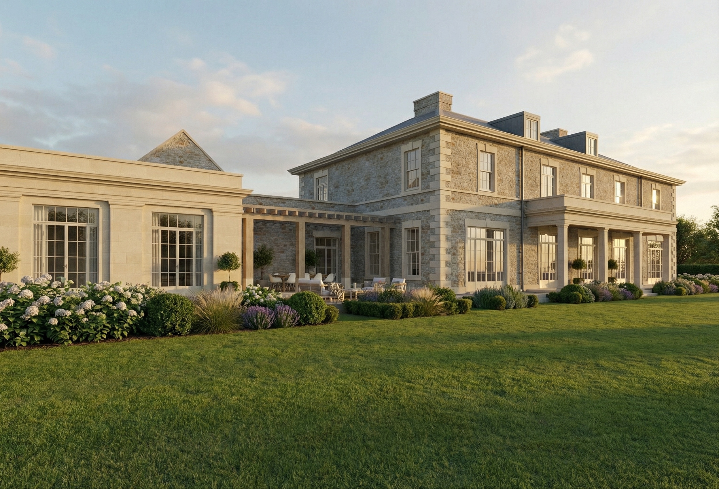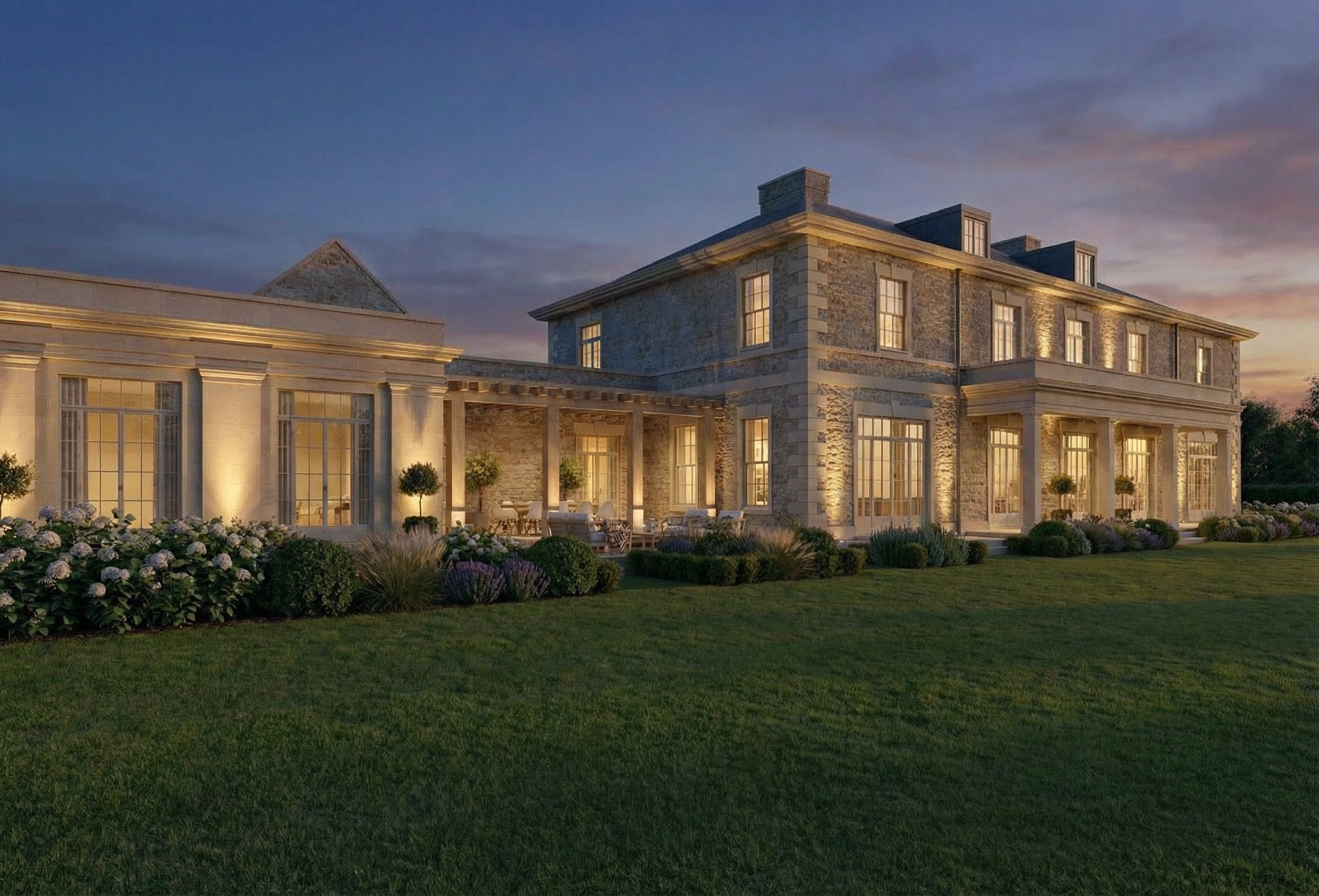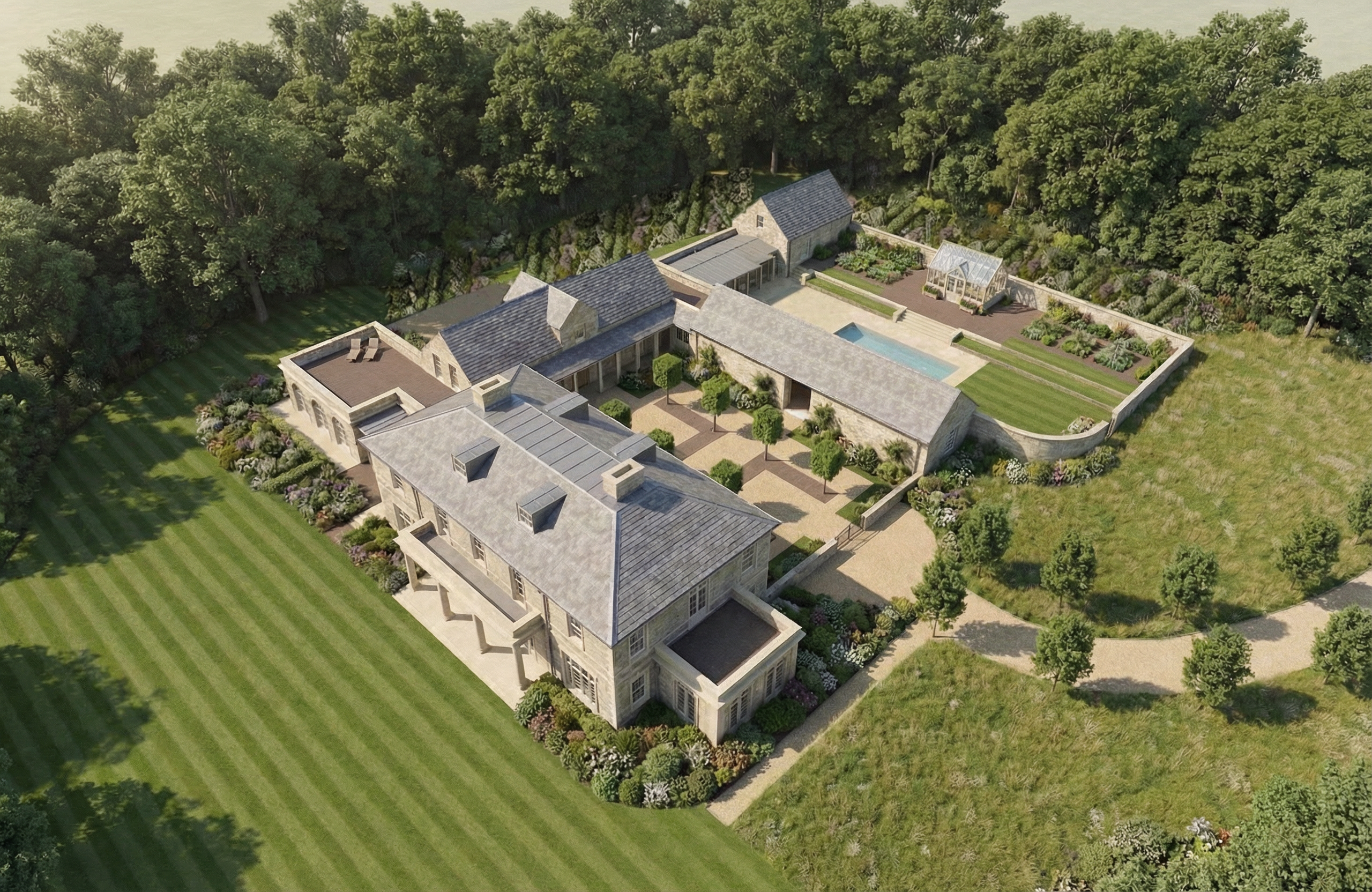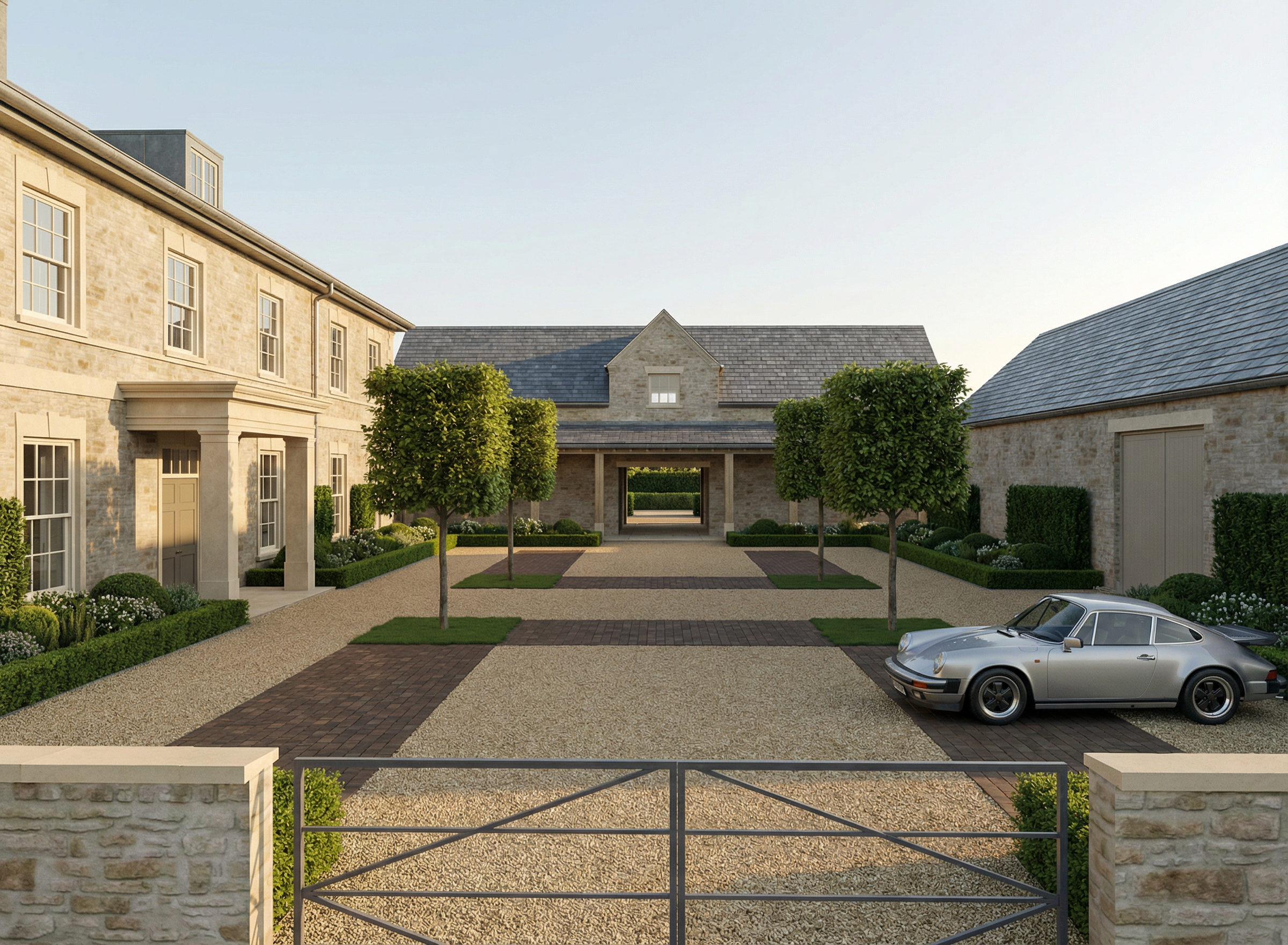 East Hampshire House East Hampshire House This project proposes the complete transformation of a rural site through the sensitive demolition of the existing buildings and their replacement with a new landscape-led dwelling, accompanied by a series of subservient ancillary structures. These buildings are carefully arranged in a traditional homestead and courtyard configuration, echoing the historic patterns of rural settlement found across the English countryside. The composition creates a clear hierarchy between the principal house and its supporting elements, while establishing a series of sheltered outdoor spaces that respond to both climate and views. At the heart of the proposal is a new family home that draws inspiration from the character and proportions of local country houses. Rather than replicating historical forms, the design interprets them in a contemporary yet respectful manner — balancing solidity and refinement. The material palette has been deliberately restrained and locally sourced, centred on natural stone and slate to root the building in its setting. Deep reveals, articulated masonry, carefully proportioned openings, and handcrafted detailing reinforce a sense of permanence and authenticity. The aim is to create a house that feels as though it has evolved naturally from the landscape — confident in its presence, yet quietly integrated within its rural surroundings. The ancillary buildings — garages, workshops, and garden structures — are designed as modest, complementary forms. Their scale, material treatment, and placement reinforce the traditional courtyard arrangement while ensuring the principal dwelling remains visually dominant. Together, the buildings frame views outward to the surrounding countryside and inward to sheltered garden spaces, establishing a strong relationship between architecture and landscape. Landscape is fundamental to the success of the scheme. The proposal includes a comprehensive package of ecological and environmental enhancements that extend well beyond the footprint of the new buildings. Existing tree belts and mature planting are retained and strengthened to preserve the site’s established character and provide habitat continuity. Areas of redundant hardstanding will be removed and rewilded, allowing native species to recolonise and restoring permeability to the ground. New planting strategies focus on biodiversity gain, seasonal variation, and long-term resilience. The result is a cohesive vision in which architecture and landscape are conceived together. The project not only replaces outdated structures with a carefully crafted new home, but also establishes a sustainable, enduring relationship between the dwelling and its wider parkland context.
