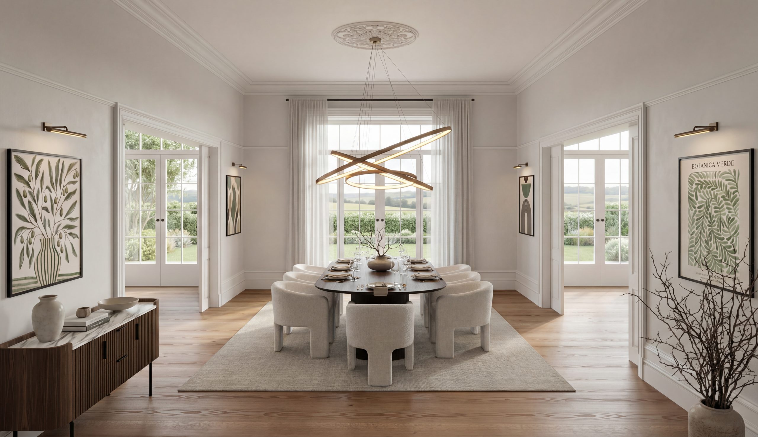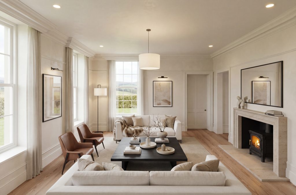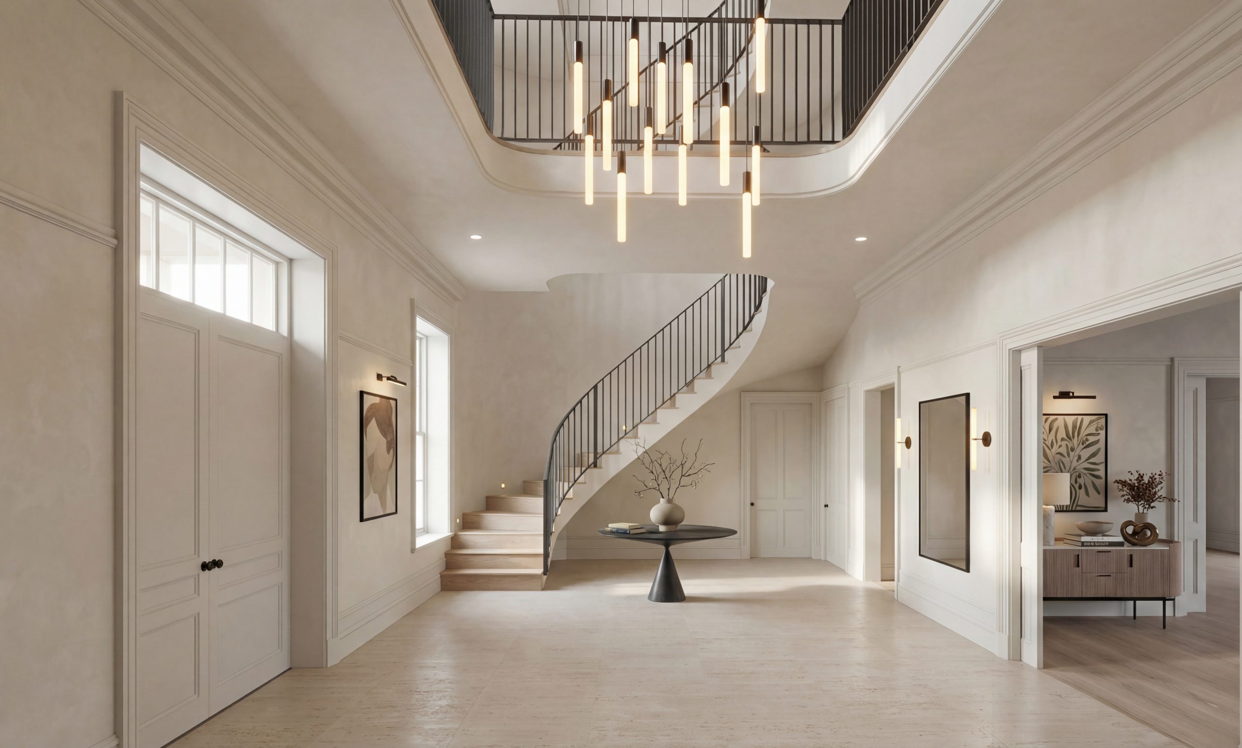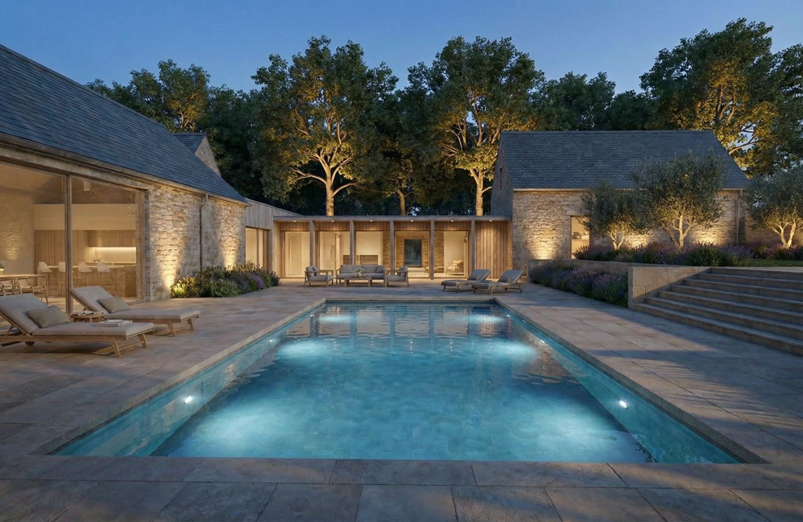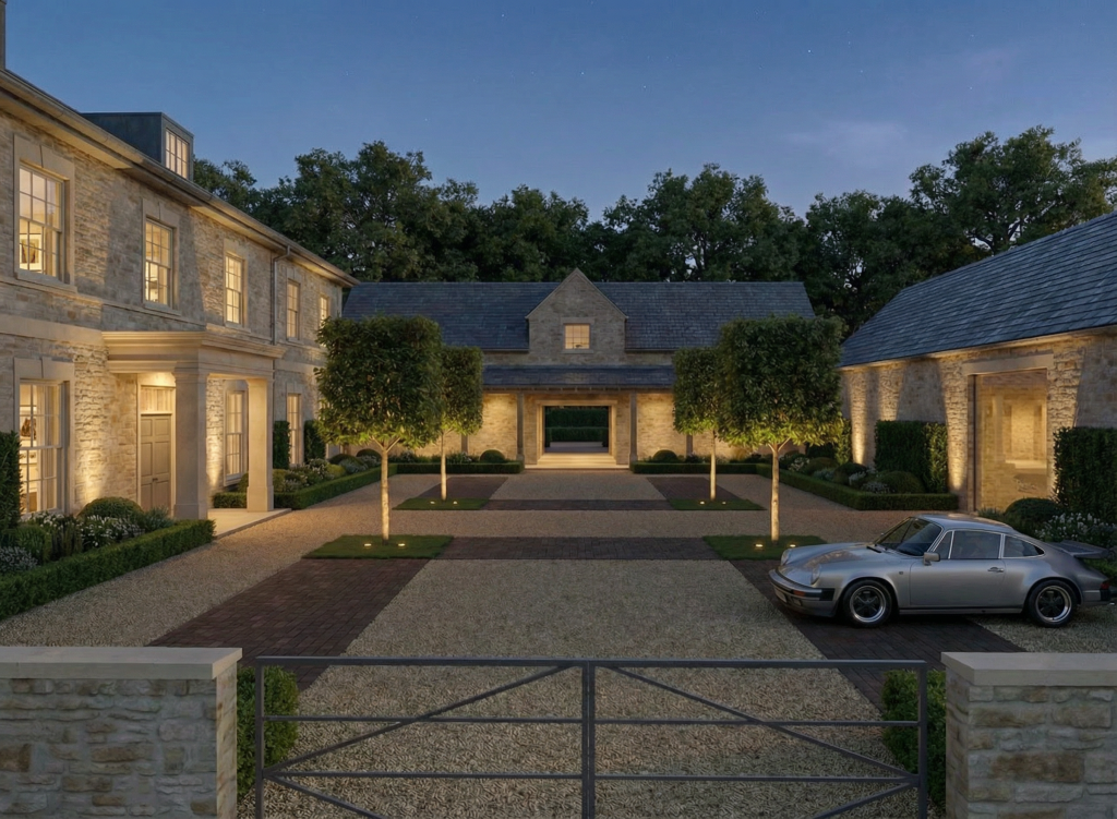 East Hampshire House East Hampshire House This project proposes the complete transformation of a rural site through the sensitive demolition of the existing buildings and their replacement with a new landscape-led dwelling, accompanied by a series of subservient ancillary structures. These buildings are carefully arranged in a traditional homestead and courtyard configuration, echoing the historic patterns of rural settlement found across the English countryside. The composition creates a clear hierarchy between the principal house and its supporting elements, while establishing a series of sheltered outdoor spaces that respond to both climate and views. At the heart of the proposal is a new family home that draws inspiration from the character and proportions of local country houses. Rather than replicating historical forms, the design interprets them in a contemporary yet respectful manner — balancing solidity and refinement. The material palette has been deliberately restrained and locally sourced, centred on natural stone and slate to root the building in its setting. Deep reveals, articulated masonry, carefully proportioned openings, and handcrafted detailing reinforce a sense of permanence and authenticity. The aim is to create a house that feels as though it has evolved naturally from the landscape — confident in its presence, yet quietly integrated within its rural surroundings. The ancillary buildings — garages, workshops, and garden structures — are designed as modest, complementary forms. Their scale, material treatment, and placement reinforce the traditional courtyard arrangement while ensuring the principal dwelling remains visually dominant. Together, the buildings frame views outward to the surrounding countryside and inward to sheltered garden spaces, establishing a strong relationship between architecture and landscape. Landscape is fundamental to the success of the scheme. The proposal includes a comprehensive package of ecological and environmental enhancements that extend well beyond the footprint of the new buildings. Existing tree belts and mature planting are retained and strengthened to preserve the site’s established character and provide habitat continuity. Areas of redundant hardstanding will be removed and rewilded, allowing native species to recolonise and restoring permeability to the ground. New planting strategies focus on biodiversity gain, seasonal variation, and long-term resilience. The result is a cohesive vision in which architecture and landscape are conceived together. The project not only replaces outdated structures with a carefully crafted new home, but also establishes a sustainable, enduring relationship between the dwelling and its wider parkland context.