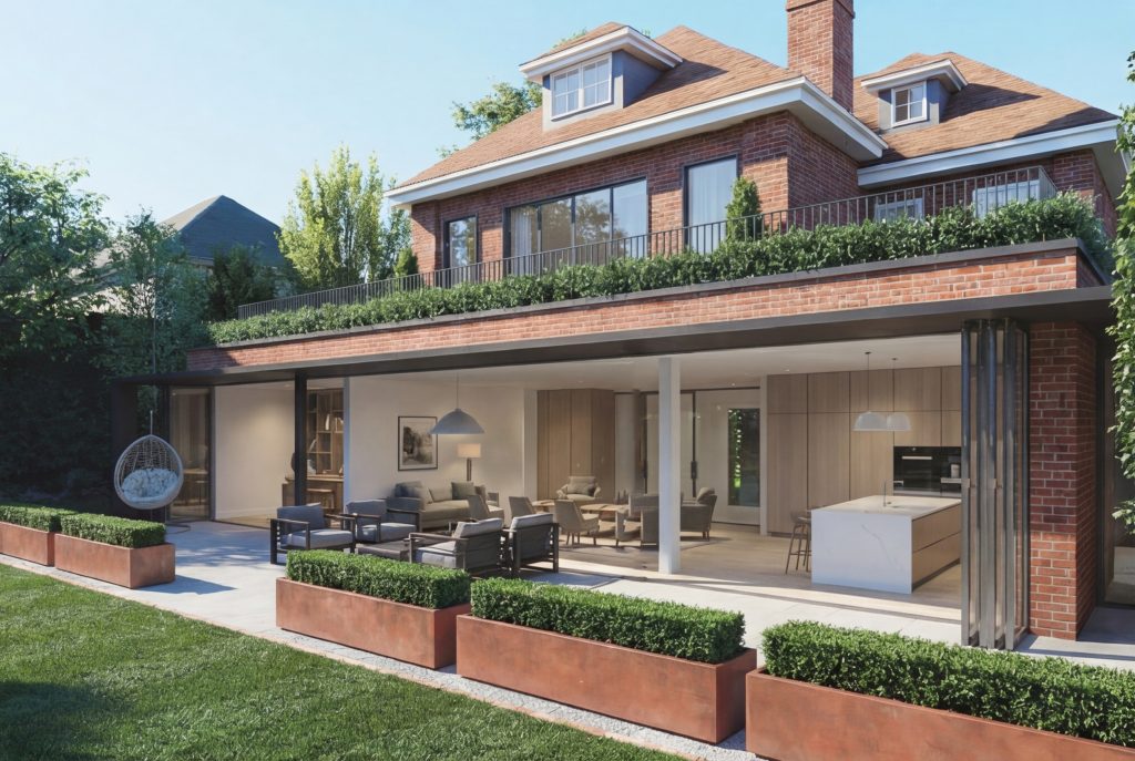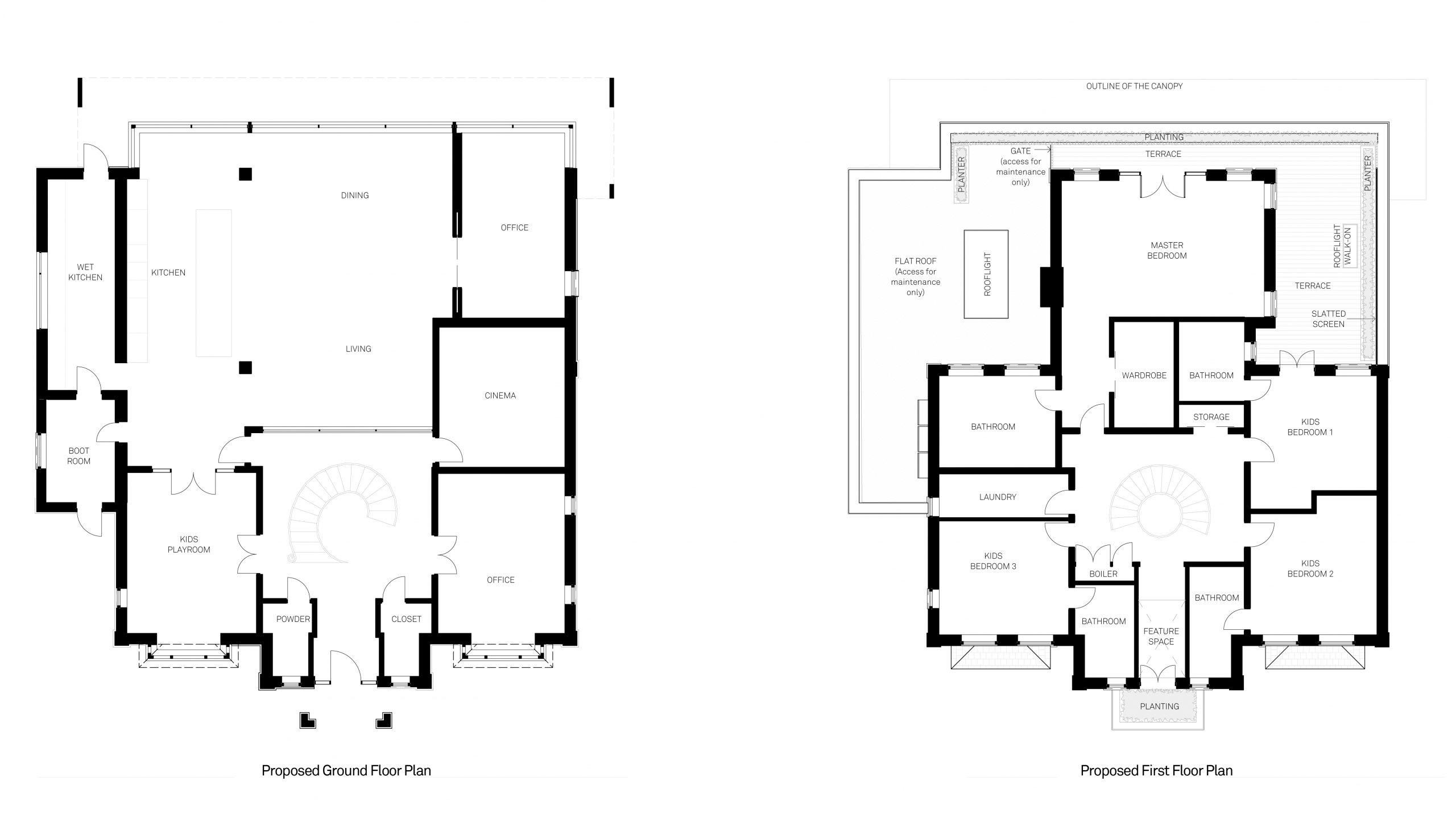 Here the aim is to create a greater connection between the living spaces and the landscape. A minimalist glazed facade will be enclosed with a sleek aluminium canopy offering shade and protection from overheating. The terrace above serves the master bedroom and is screened by railings incorporated into planters.